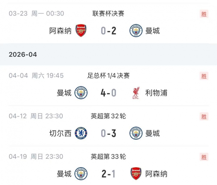 值得一提的是,曼城在近一个月内两次击败枪手,先是在联赛杯决赛2-0力压对手夺冠,今日击败阿森纳更是将分差追到三分,在少赛一场的情况下,只要下周中击败伯恩利,就将领跑积分榜。