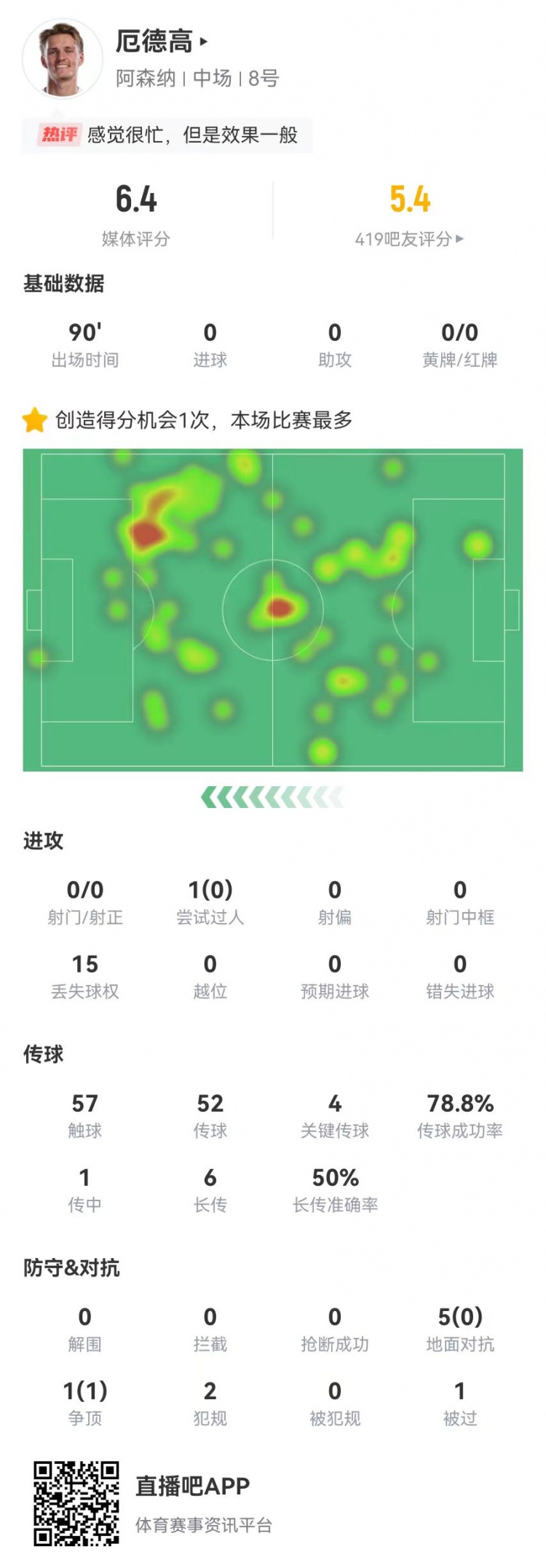 直播吧4月20日讯 阿森纳在本轮英超1-2不敌曼城,厄德高本场数据如下:
