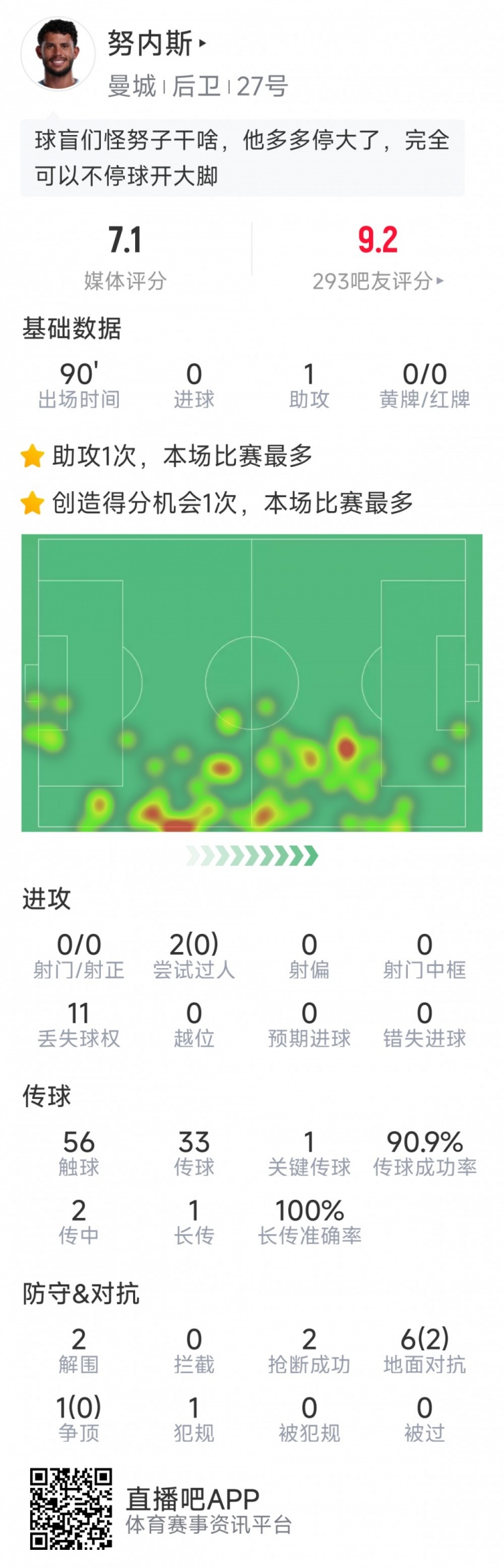 直播吧4月20日讯 在本轮英超,曼城2-1击败阿森纳,本场比赛努内斯送出助攻,以下为他在本场数据: