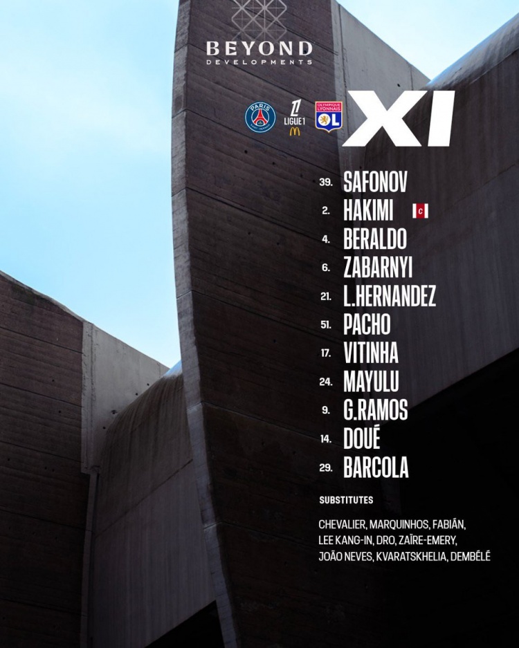 39-萨福诺夫、2-阿什拉夫、4-贝拉尔多、6-扎巴尔尼、21-卢卡斯、51-帕乔、17-维蒂尼亚、24-马尤卢、9-贡萨洛·拉莫斯、14-杜埃、29-巴尔科拉