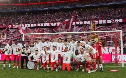 >拜仁全队赛后大合照庆祝,莱默尔姗姗来迟、迪亚斯搞怪开溜
