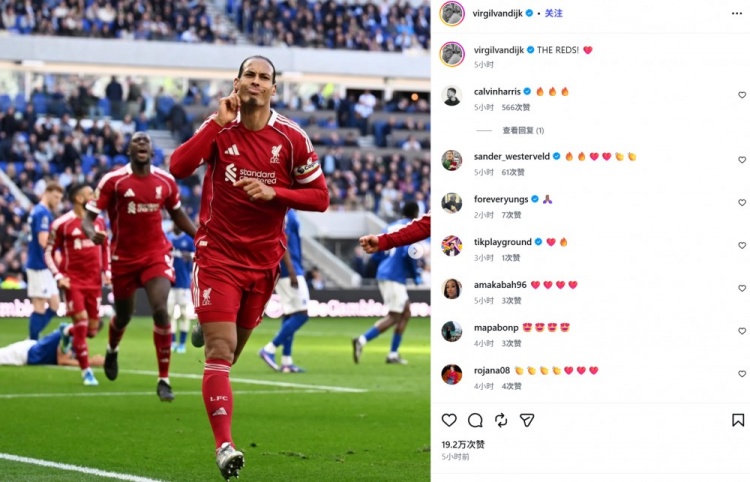 范戴克也在赛后通过社媒晒出自己进球后的庆祝照,并配文:“红军!”