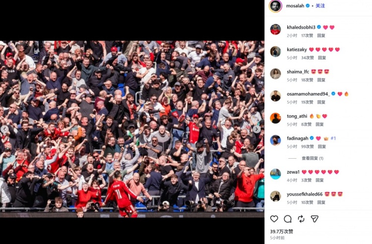 由于萨拉赫已经官宣赛季结束后离队,这也将是他在默西赛德郡德比的最后一球。他也在赛后通过社媒晒出自己进球后和利物浦球迷的互动庆祝照,依然没有附加文字内容。