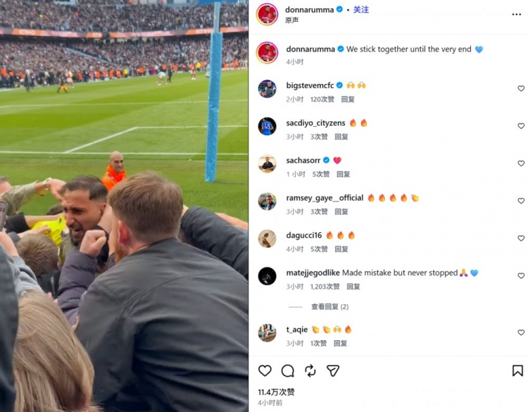 他也在赛后通过社媒晒出自己和曼城球迷相拥的动态,并配文:“我们团结到了最后一刻。”