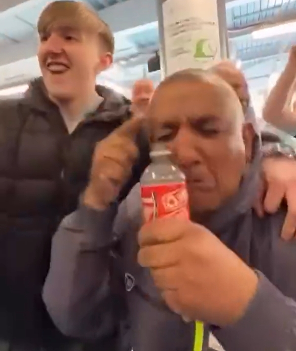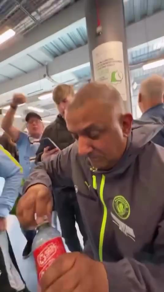 赛后曼城球迷“水瓶哥”拧开瓶盖,接起了眼泪嘲讽。