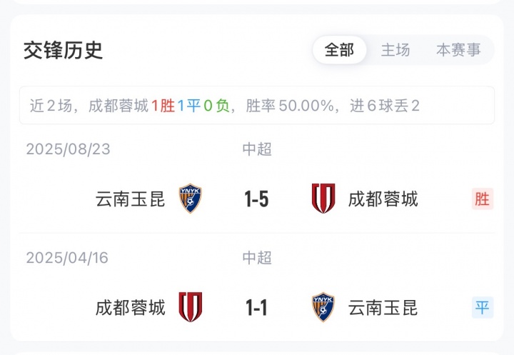 积分榜方面,蓉城前6轮5胜1平,积16分高居联赛榜首;玉昆则是3胜3负,积9分排在第4。