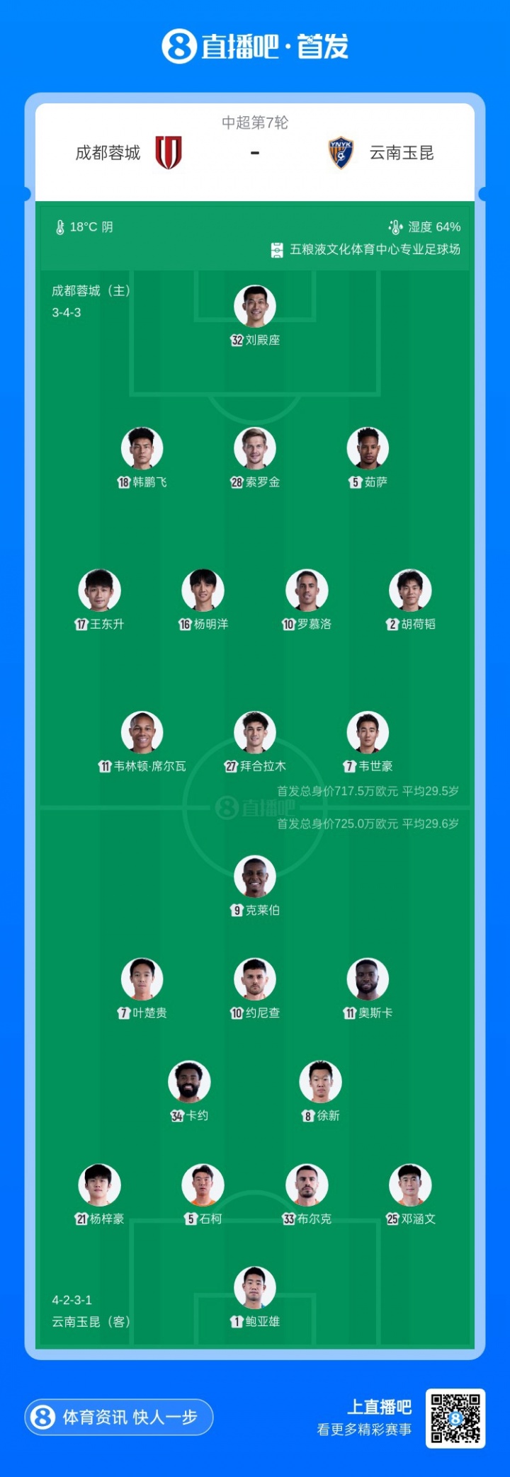 直播吧04月21日讯 北京时间今晚19点35分,中超第7轮,成都蓉城vs云南玉昆,赛前两队首发阵容出炉。【本场比赛,蓉城方面拜合拉木、韦世豪先发,费利佩替补,玉昆方面奥斯卡、徐新、约尼查出战】