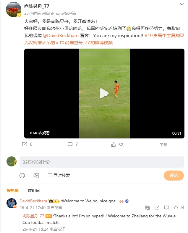 贝克汉姆在尚陈昱舟的评论区评论:“欢迎开通微博,漂亮的进球!”