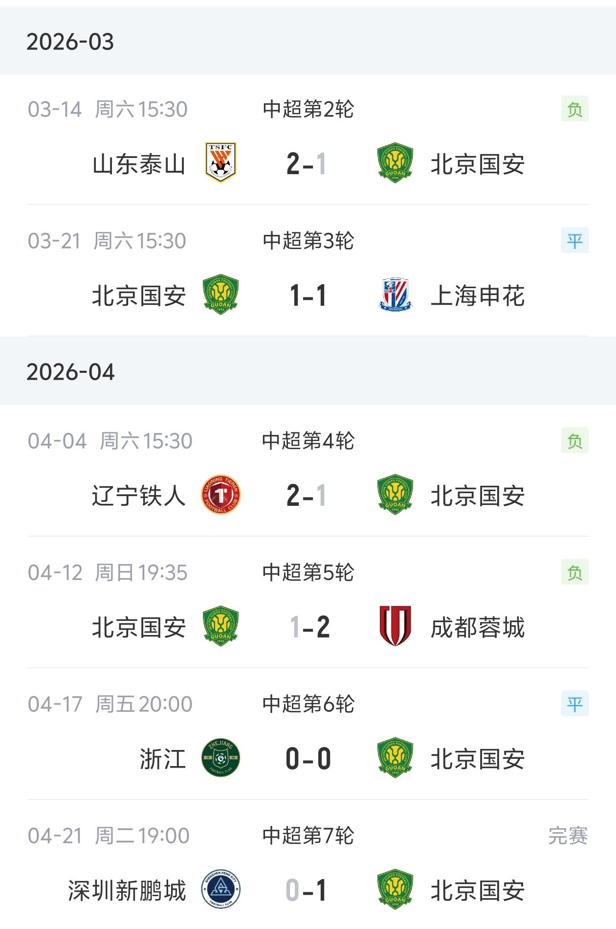 直播吧04月21日讯 中超第7轮,北京国安客场1-0绝杀深圳新鹏城。此役过后国安终结了球队连续5轮中超的不胜战绩。国安中超首轮客场2-0击败武汉三镇后,随后对阵泰山、申花、铁人、蓉城、浙江连续5轮未尝胜绩。