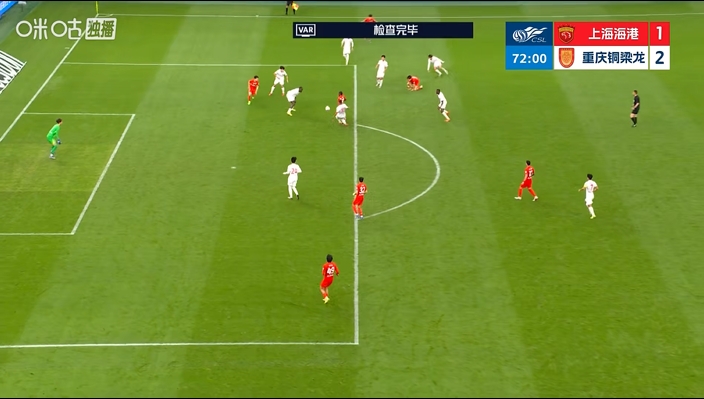 直播吧04月21日讯 中超第7轮,上海海港vs重庆铜梁龙。比赛第72分钟,VAR介入检查点球事件,最终认定非点球。回放显示,安佩姆在禁区内争抢时有一次碰撞后倒地。