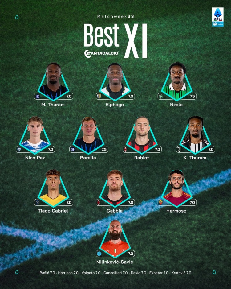 直播吧4月21日讯 意甲第33轮比赛已经结束了全部的争夺,联赛官方评选出了本轮最佳阵,图拉姆兄弟联袂入选,巴雷拉、加比亚、拉比奥特、尼科·帕斯在列。