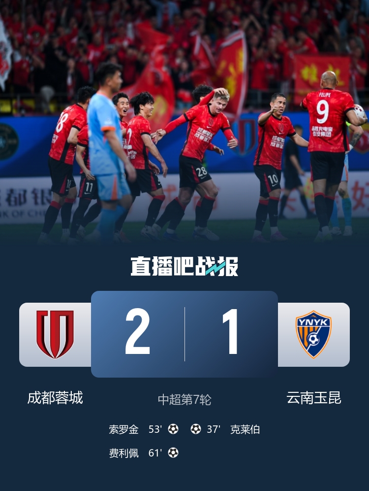 直播吧4月21日讯 北京时间4月21日晚19时35分,2026赛季中超第7轮在五粮液文化体育中心展开角逐,成都蓉城主场迎战云南玉昆。上半场克莱伯首开记录,拜合拉木两度进球越位,下半场索罗金头球吊射扳平,玉昆进球被VAR改判手球无效,费利佩替补反超,罗慕洛和韦林顿助攻,王子铭失单刀,奥斯卡绝平被吹越位。最终成都蓉城主场2-1逆转云南玉昆,蓉城开局7轮6胜1平+4连胜,积19分继续领跑,玉昆近4轮遭3负,积9分仍居第4。