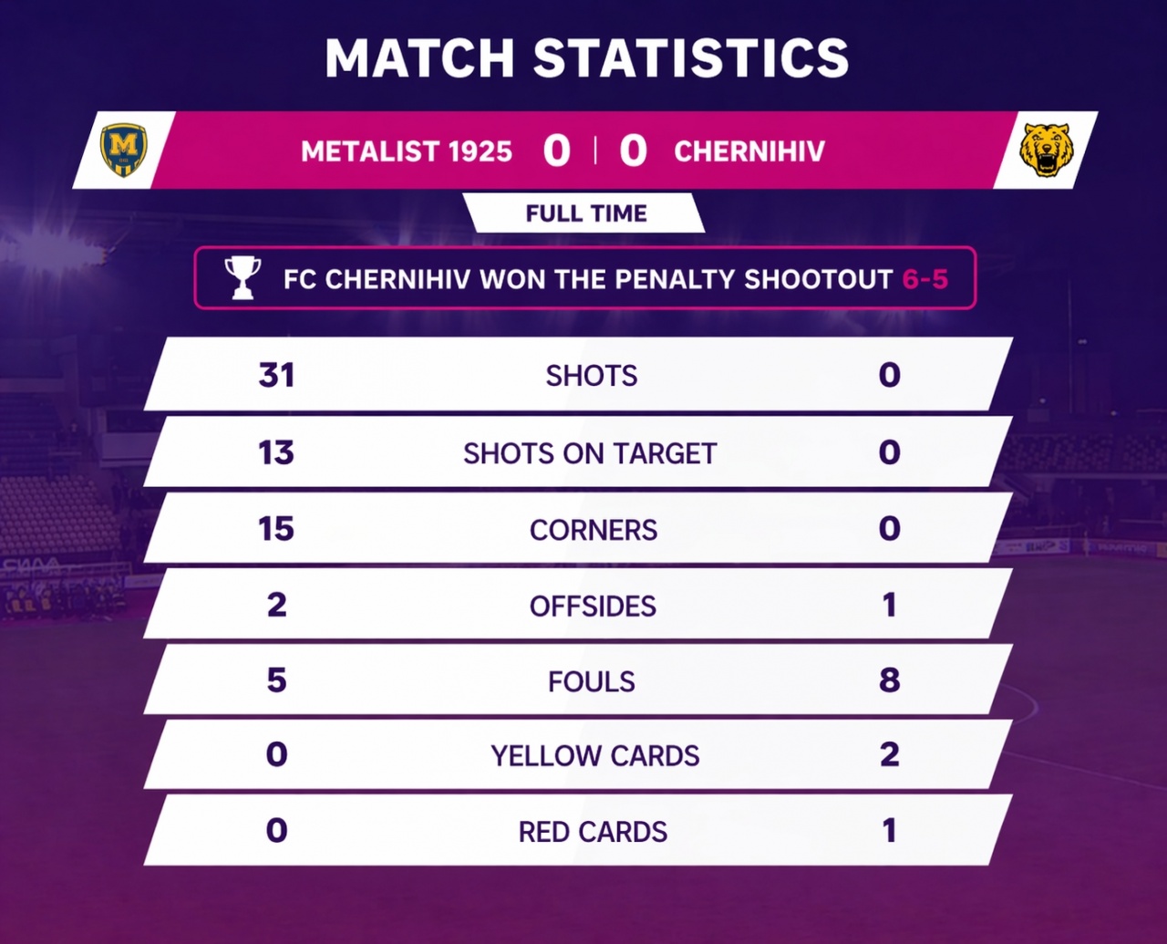 然而,切尔尼夫队的门将马克西姆·塔塔连科表现出色,力保球门不失。最终,比赛进入点球大战,切尔尼戈夫队以5比6的比分爆冷获胜。