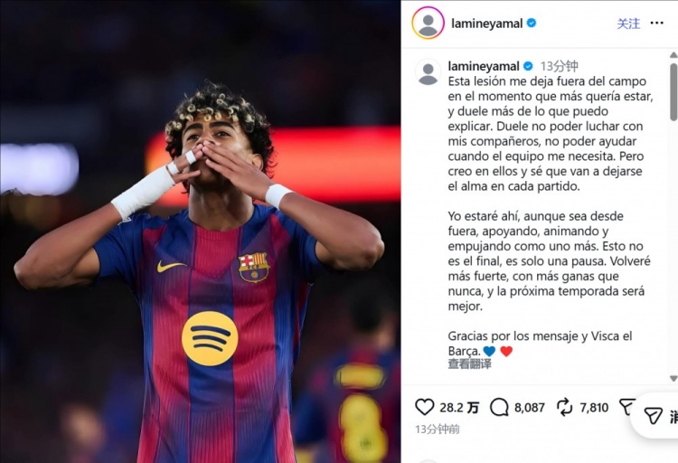 亚马尔写道:“这次伤病让我被迫离开球场,而现在正是我最渴望登场的时刻,这种痛苦无法用言语来形容。痛苦源于无法与队友们并肩作战,源于无法在球队最需要我的时候提供帮助。但我相信他们,我知道他们会在接下来的每场比赛中倾尽全力。”