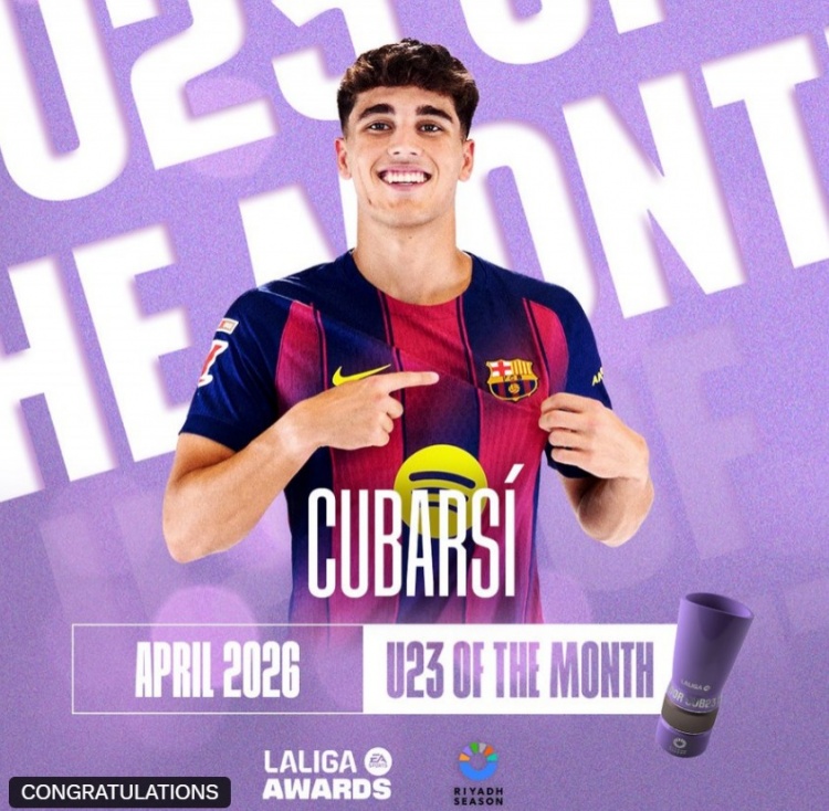 助巴萨三战全胜,西甲官方:库巴西当选联赛4月最佳U23球员