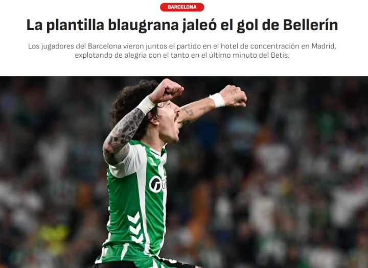 该媒体指出,巴塞罗那全队疯狂庆祝他们前队友埃克托·贝莱林在比赛最后时刻的进球,这粒进球几乎意味着巴萨将确保联赛冠军。这场平局让巴塞罗那领先8分,并且少赛一场。这意味着如果他们击败赫塔费,领先优势将扩大到11分,而联赛只剩下15分可以争夺,这让他们有可能在国家德比前就能得到列队欢迎。如果本轮战平,球队将领先9分,仍然有机会在国家德比前锁定冠军。而在最糟糕的情况下,即使输给赫塔费,弗里克的球队仍然在只剩下5场比赛的情况下保持多达8分的领先优势。