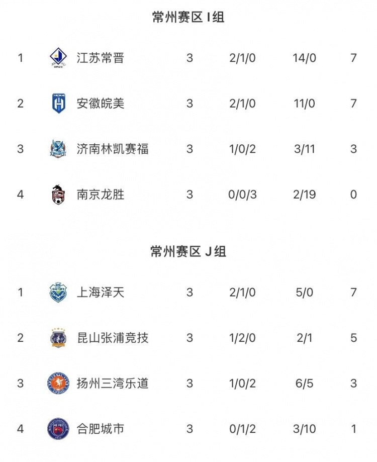 直播吧4月25日讯 据中冠联赛官方报道,中冠联赛大区赛结束多场争夺。其中,安徽皖美7-0南京龙胜、昆山张浦竞技0-0上海泽天、江苏常晋5-0济南林凯赛福、合肥城市2-6扬州三湾乐道。