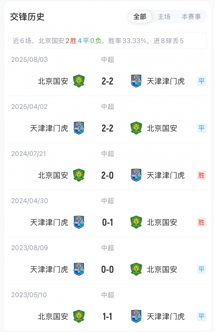 国安前七轮2胜2平3负,目前3个积分排中超第10;津门虎1胜2平4负,负5分排名垫底。