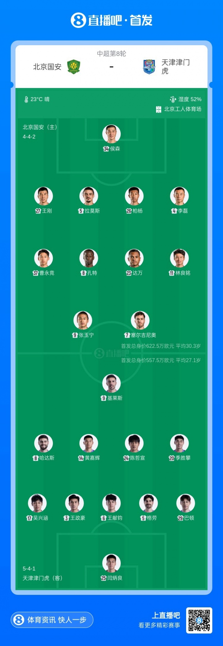 直播吧04月25日讯 今晚19:35中超第8轮将上演京津德比,北京国安vs天津津门虎。赛前首发阵容公布。两队均派出3外援先发,国安方面法比奥仍缺席,张玉宁先发出任队长;巴顿先发战旧主,津门虎外援谢蒂内本场替补。