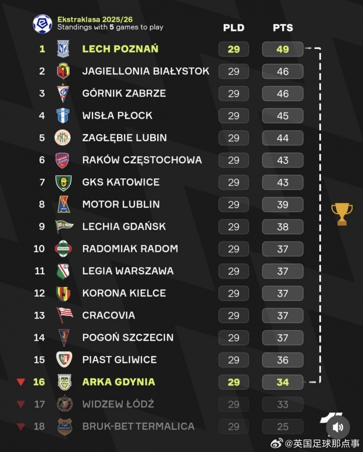 >降级区球队都能争冠!?波兰联赛剩5轮,仍有16队理论上能争冠