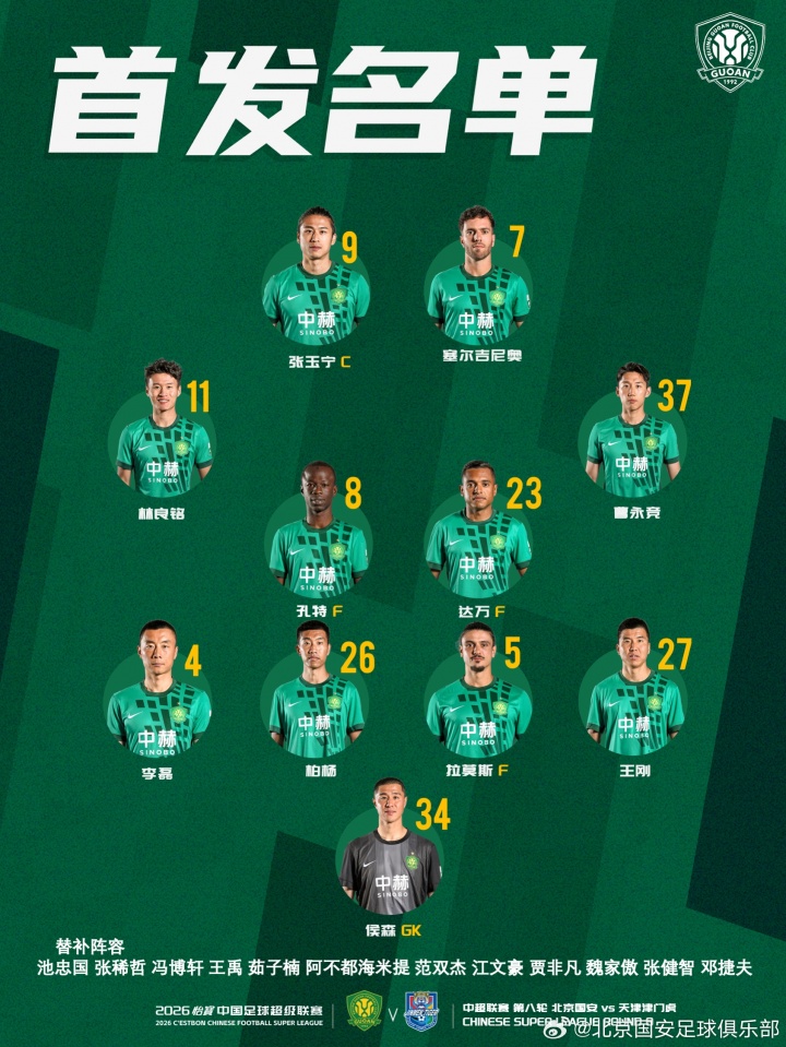 💚 北京国安今日首发 💪 京津大战 🔰 拼!