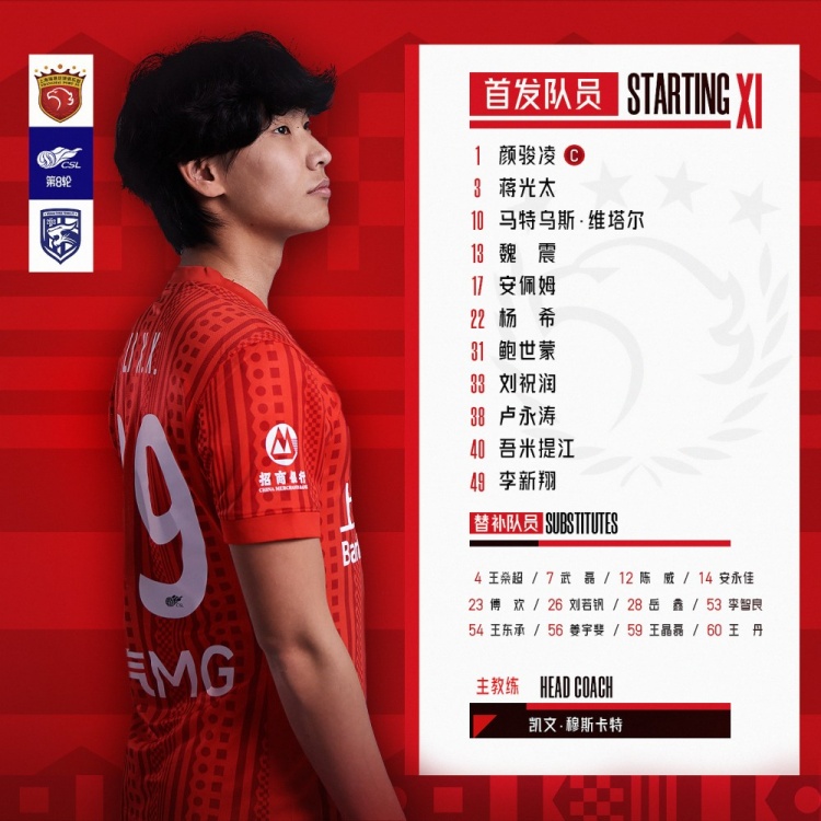 中超联赛第八轮,上海海港vs武汉三镇首发名单