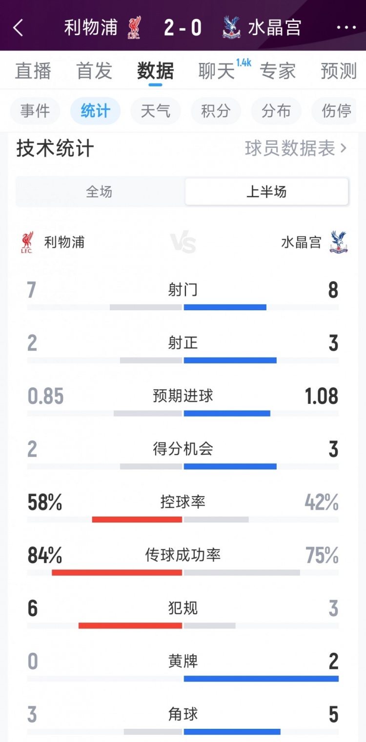 直播吧4月25日讯 在本轮英超上半场,利物浦2-0领先水晶宫,以下为双方半场数据对比: