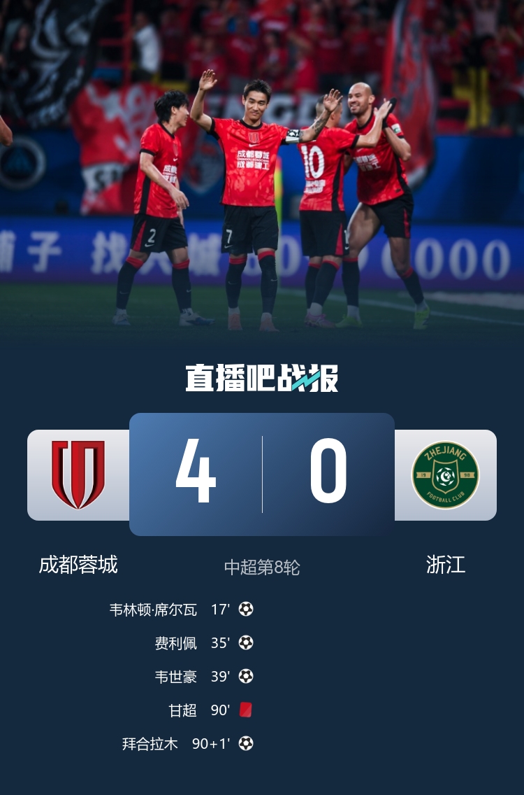 直播吧4月25日讯 北京时间4月25日晚19时整,2026赛季中超第8轮在五粮液文化体育中心展开角逐,成都蓉城主场迎战浙江。上半场瓜里拉帕闪击越位,韦林顿传射+8轮6球4助,费利佩和韦世豪扩大比分,下半场甘超蹬踏王钰栋直红,拜合拉木破门。最终成都蓉城主场4-0大胜浙江,蓉城豪取联赛5连胜+8轮7胜1平不败,先赛积22分以5分优势领跑,浙江近5轮4负1平不胜,积3分位居第11。