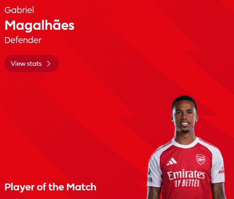 本场比赛阿森纳后卫加布里埃尔首发出场表现稳健,贡献5次解围,赛后当选英超官方球迷票选全场最佳球员。