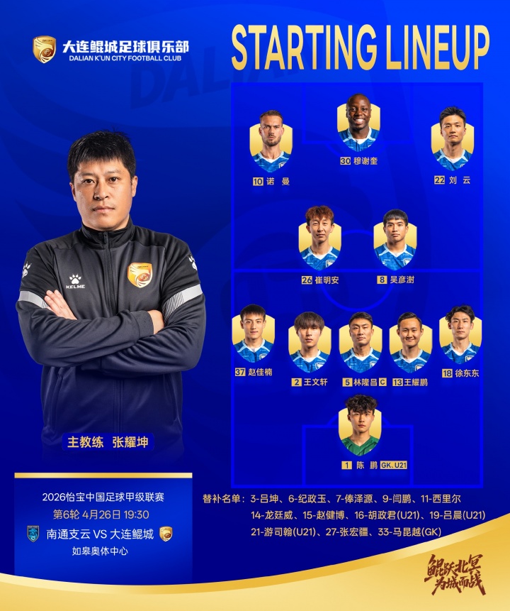 2026怡宝中甲联赛第6轮,大连鲲城客场对阵南通支云首发阵容出炉