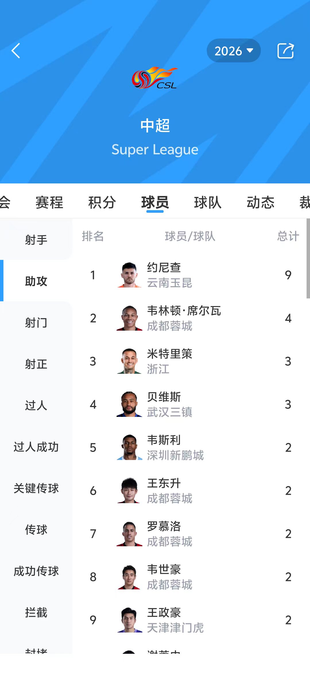 上赛季中超助攻王克雷桑27场贡献9次助攻,纳萨里奥29场贡献9次助攻。本场比赛结束,约尼查已追平上赛季的助攻记录。