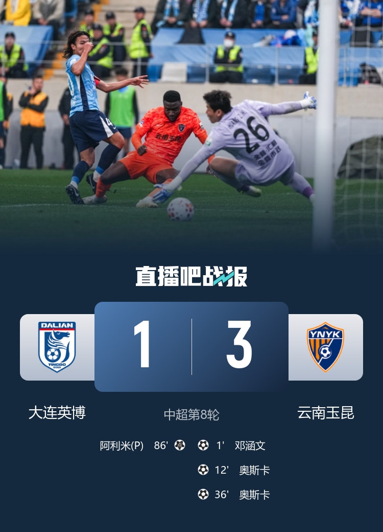 直播吧04月26日讯 中超第8轮,大连英博主场1-3不敌云南玉昆。联赛五连胜终结。