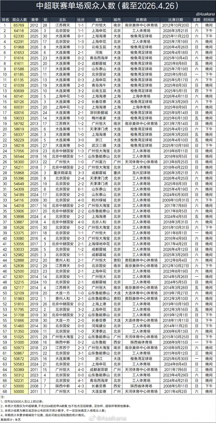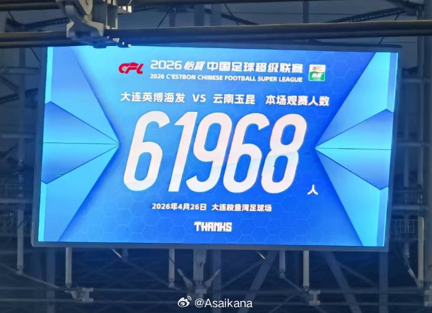 在今天(2026年4月26日)晚上举行的中超联赛第8轮大连英博vs云南玉昆的比赛,大连梭鱼湾足球场有61968名球迷现场观战。这一数字在今年国内所有足球比赛里暂列第二位,仅次于京沪德比。在整个中超历史上,这一数字排在第5位。
