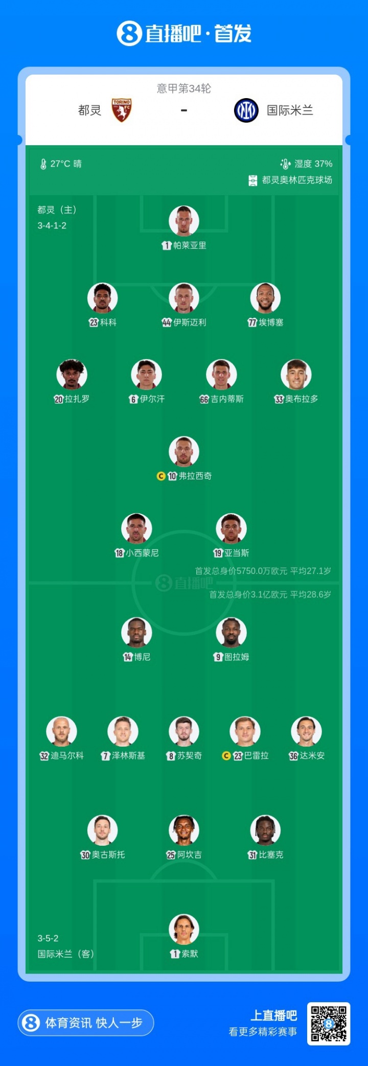 都灵首发:1-帕莱亚里、23-索尔·科科、44-伊斯迈利、77-埃博塞、20-拉扎罗、6-伊尔汗、66-吉内蒂斯、33-奥布拉多、10-弗拉西奇、18-吉奥瓦尼·西蒙尼、19-切·亚当斯