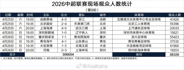 2026赛季中超联赛第8轮,8场比赛现场观众总人数高达306604人,首次突破30万人,场均达38326人,再次刷新了中超单轮现场观众人数新纪录!此前纪录为本赛季第3轮的285546人。