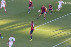 第60分钟,博洛尼亚左侧角球机会,皮球开到后点,左脚调整攻门击中横梁弹出↓