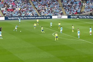 下半场伤停补时7分钟,曼城反击,多库超级单刀球半场过掉出击的门将没有选择射门,最终再传给萨维尼奥时,球员已经回防到位,萨维尼奥的射门被防守球员门线解围。↓