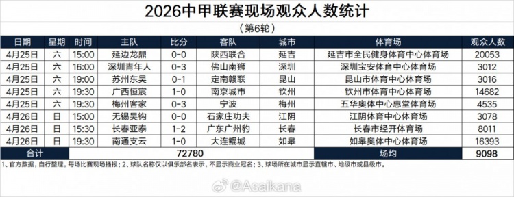 >中甲第6轮观众数:延边龙鼎vs陕西联合超2万人居首,场均9098人