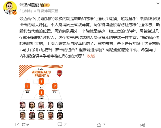 直播吧04月27日讯 知名评述员詹俊在社媒发文,谈到阿森纳在赛季冲刺阶段的阵容安排。