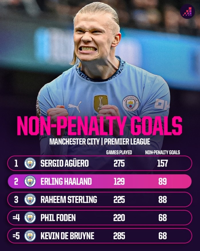 直播吧4月27日讯 数据网站OPTA盘点了曼城队史英超非点球射手榜,其中哈兰德仅次于阿圭罗,具体如下: