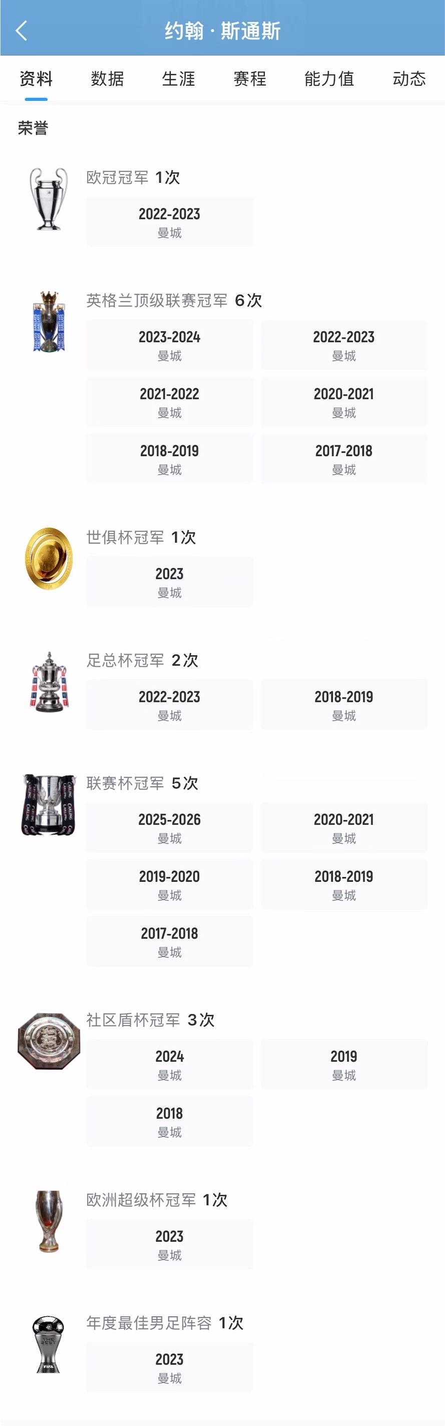 31岁的斯通斯在这十年里为俱乐部历史上最辉煌、最成功的时代做出了巨大贡献,这一点毋庸置疑。截至目前,斯通斯帮助曼城赢得19座主要冠军奖杯,包括:6次英超联赛冠军、1次欧冠冠军、2次足总杯冠军、5次联赛杯冠军、3次社区盾杯、1次世俱杯和1次欧洲超级杯。