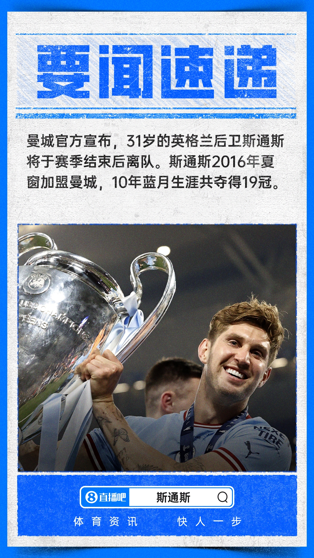 斯通斯通过其官方Instagram账号发布视频,宣布了这一决定。现在,俱乐部和所有球迷将在赛季末为这位曼彻斯特城足球俱乐部的优秀功臣举行隆重的致敬和告别仪式。