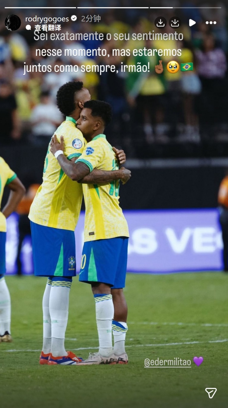 米利唐接受股二头肌近端肌腱断裂修复手术,将错过世界杯,同样因伤错过世界杯的罗德里戈社媒晒出与米利唐的合照,配文:“我完全理解你此刻的感受,但我们会像往常一样始终站在一起,兄弟!”