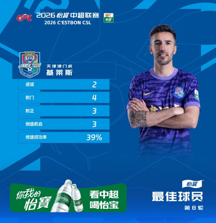 在该轮天津津门虎客场4-2击败北京国安的比赛中,基莱斯分别在第70分钟和第89分钟完成进球,帮助津门虎锁定胜局,并被评选为第8轮最佳球员。