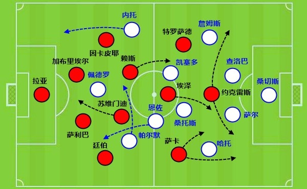 不过阿森纳的防守习惯要么是高位的压迫,要么是在回到本方半场后回撤很快,在中圈附近反倒是没那么大的力度,也有可能被格列兹曼加以利用。