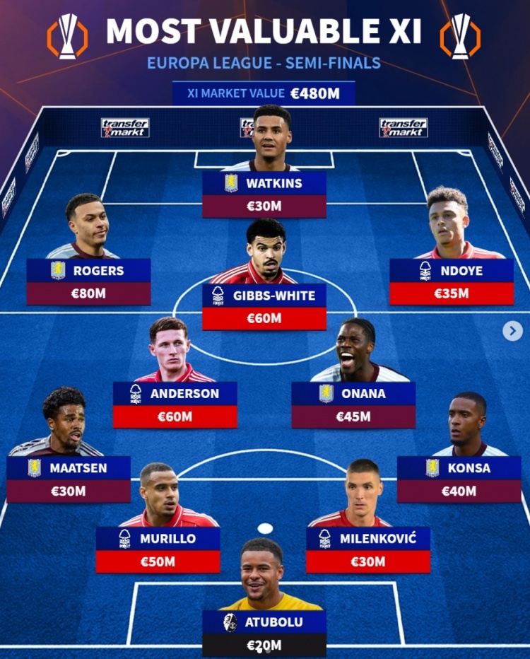 直播吧4月30日讯 欧联杯半决赛即将开战,德转也列出了欧联四强最贵阵,维拉、森林各5将入选,弗赖堡门将阿图伯鲁在列。