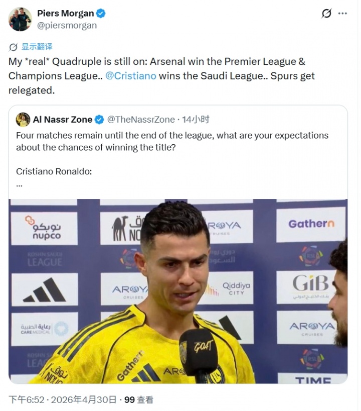 直播吧04月30日讯 今晨,阿森纳1-1战平马竞,利雅得胜利2-0吉达国民继续领跑沙特联。名嘴摩根社媒发文,表示自己的四冠王梦想还在继续。