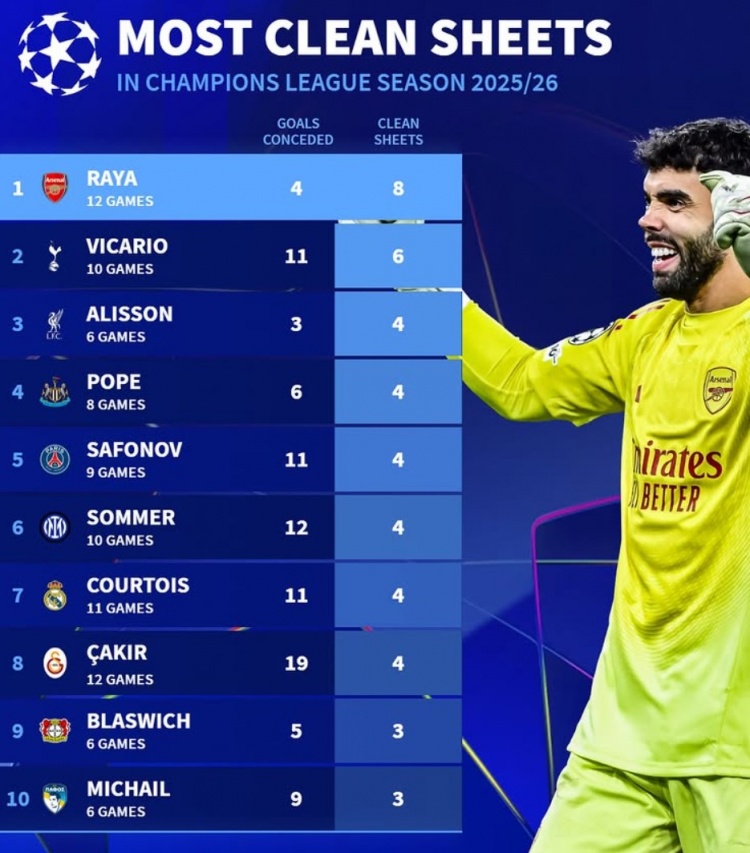 直播吧4月30日讯 阿森纳在本轮欧冠客场1-1战平马竞,拉亚未能继续零封,但他本赛季依然领跑欧冠零封榜。